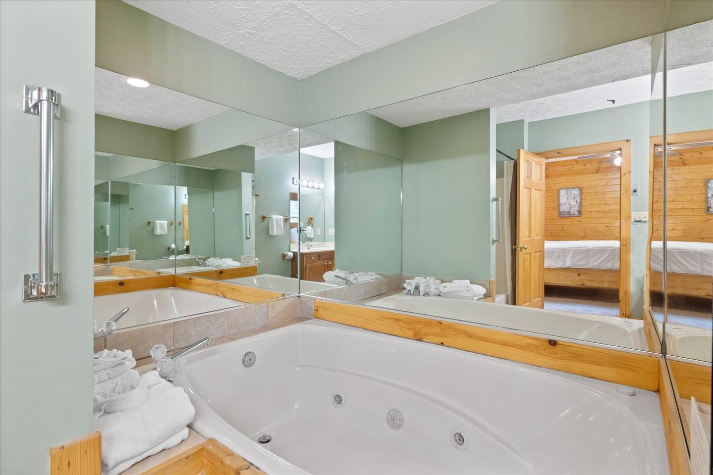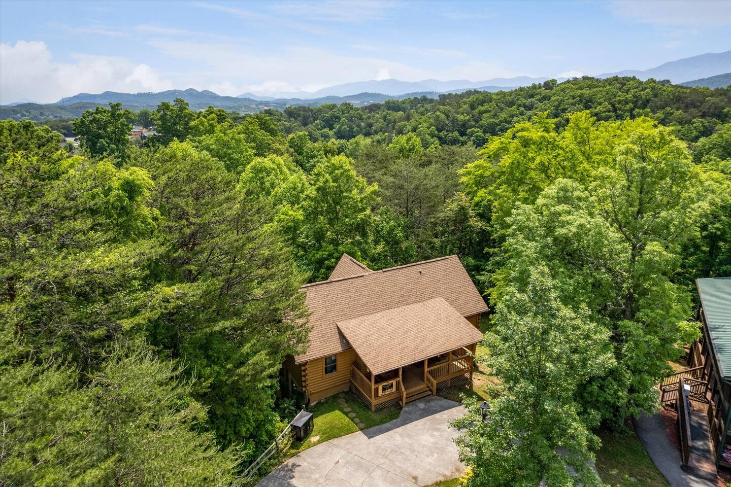 1 MILE TO THE PARKWAY with no steep/narrow roads. You can even hear the Dollywood Steam Train from the back deck, but have total privacy and virtually no other city noises. 4 private bedrooms, 4 full bathrooms, 1 half bathroom, fireplace, SPORTS on all 6 TV's, brand new hot tub, billiards table, arcade games, laundry room, two private decks, covered front deck, and PLENTY of parking (6-8 cars). NOT YOUR GRANDMA'S CABIN! No plaid, no apples, no white appliances. This one is updated!